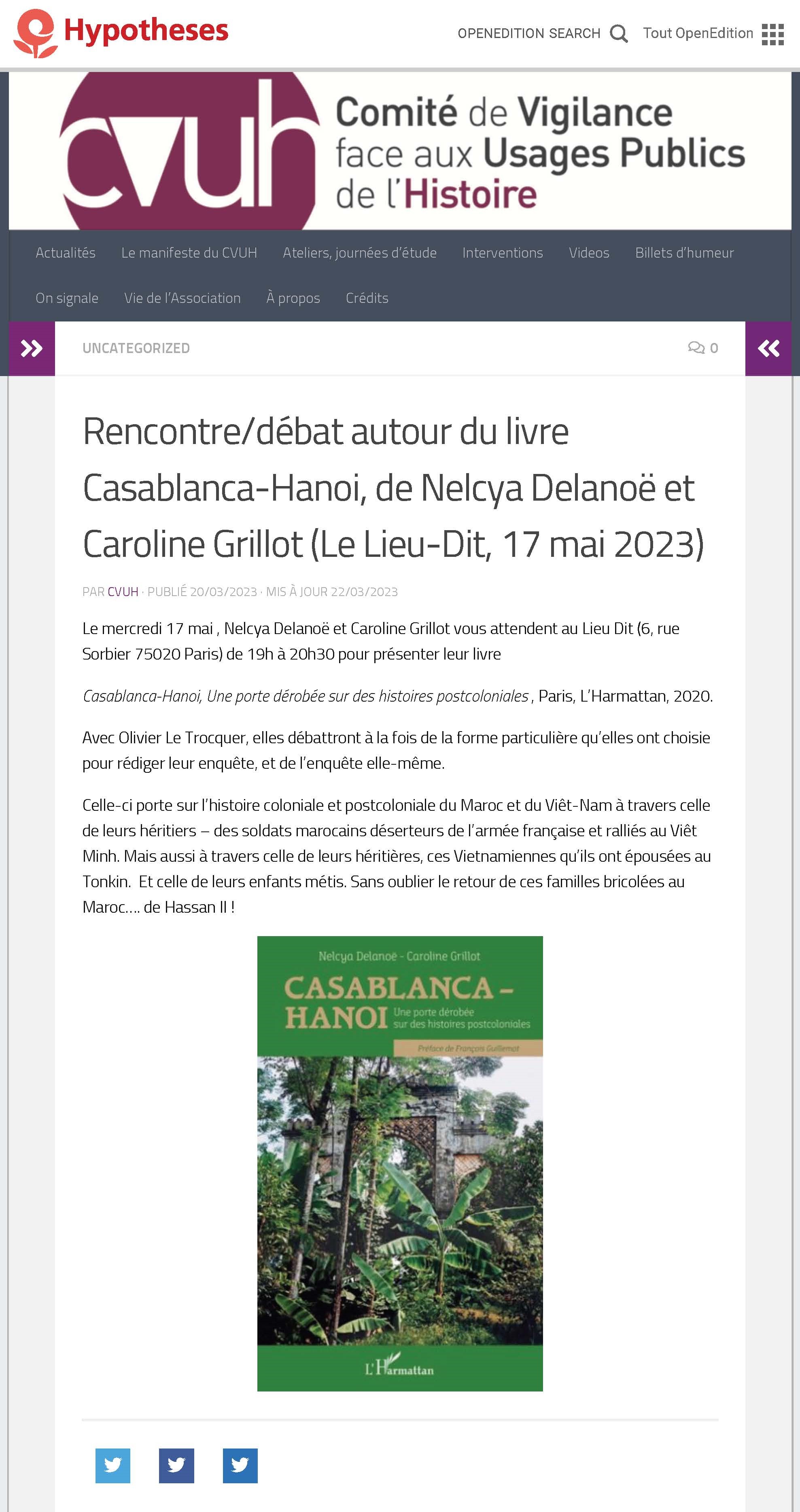 Rencontre/débat autour du livre Casablanca-Hanoi, de Nelcya Delanoë et Caroline Grillot (Le Lieu-Dit, 17 mai 2023)