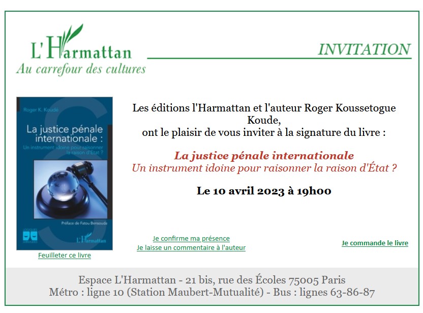 Roger Koussetogue Koude sera en signature pour son livre "La justice pénale internationale" à l'Espace Harmattan