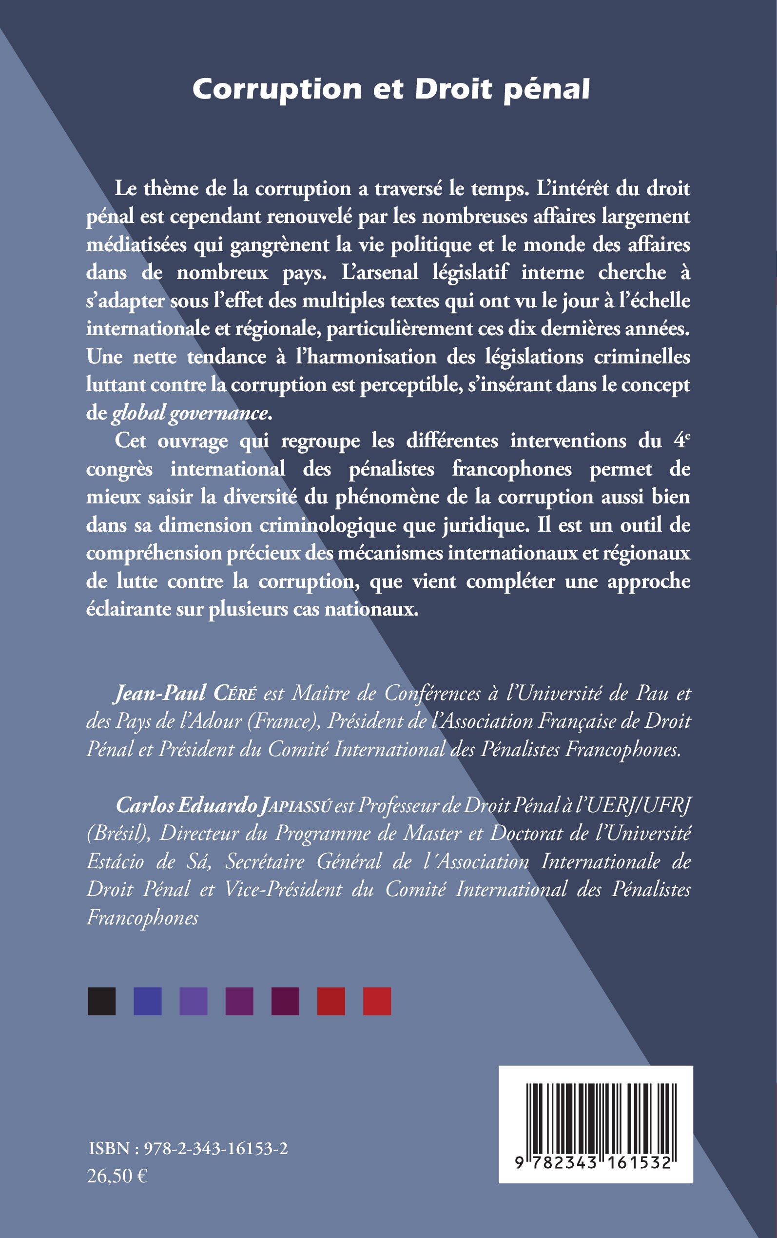 Le thème de la corruption a traversé le temps. L'intérêt du droit pénal est cependant renouvelé par les nombreuses affaires médiatisées qui gangrènent la vie politique et le monde des affaires dans de nombreux pays. L'arsenal législatif interne cherche à s'adapter sous l'effet des multiples textes qui ont vu le jour à l'échelle internationale et régionale. Une nette tendance à l'harmonisation des législations criminelles anti-corruption est perceptible. Cet ouvrage permet de saisir la diversité du phénomène dans sa dimension criminologique et juridique.
