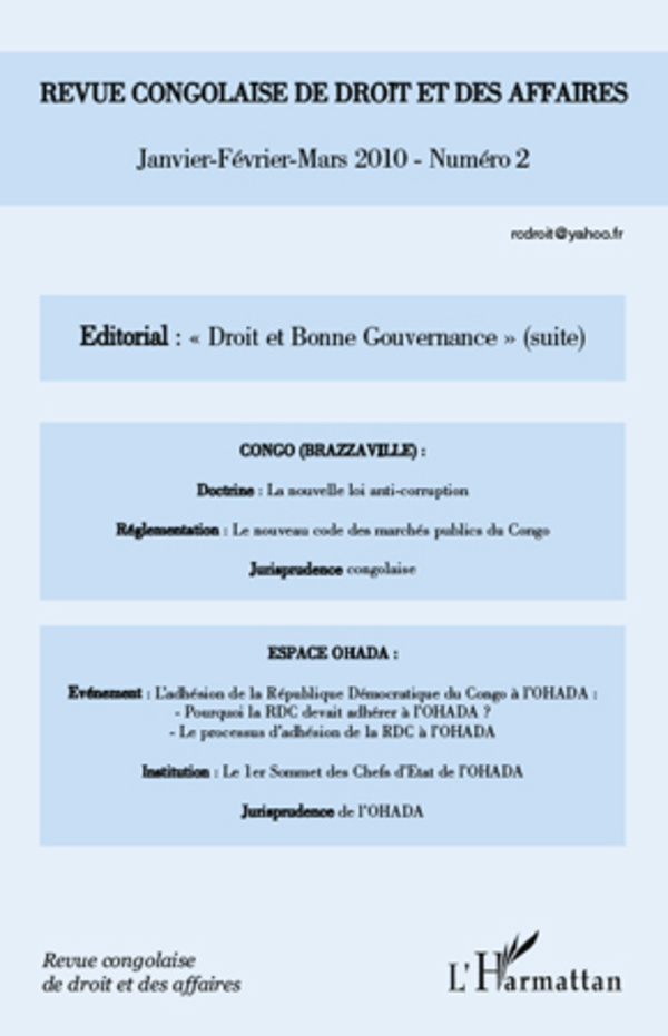 Après l'éditorial consacré au ""Droit et bonne gouvernance"", ce numéro aborde deux thématiques, l'une sur le Congo Brazzaville (La nouvelle loi anti-corruption, le nouveau code des marchés publics au Congo, Jurisprudence congolaise) et l'Espace OHADA (l'adhésion de la RDC à l'OHADA, le 1er sommet des Chefs d'Etat de l'OHADA, Jurisprudence de l'OHADA).
