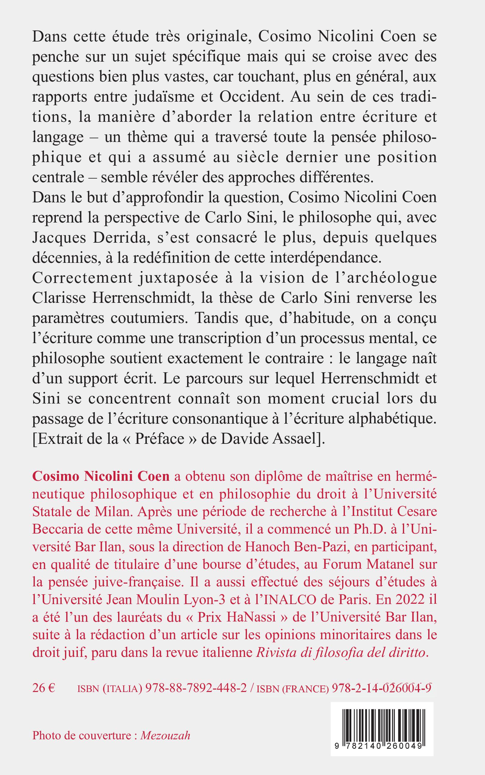 C. Nicolini Coen, diplômé en herméneutique philosophique et philosophie du droit à l'Université de Milan (Italie), est doctorant de recherche à l'Université Bar Ilan (Israël)