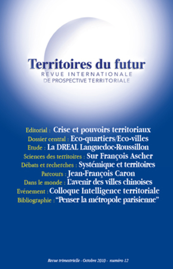 Au sommaire de ce numéro : La crise fait émerger une nouvelle répartition des rôles / Eco-quartiers et Eco-villes : articulations entre les logiques d'échelles / Etude de prospective territoriale : le Languedoc-Roussillon / F. Ascher et la démarche prospective : compagnonnage ou malentendu ? / Systémique et territoires / Parcours : Jean-François Caron, Maire de Loos-en-Gohelle (Pas-de-Calais) / L'avenir des villes chinoises se joue dans leur périphérie / Les rencontres Grand Ouest de l'intelligence territoriale 2010